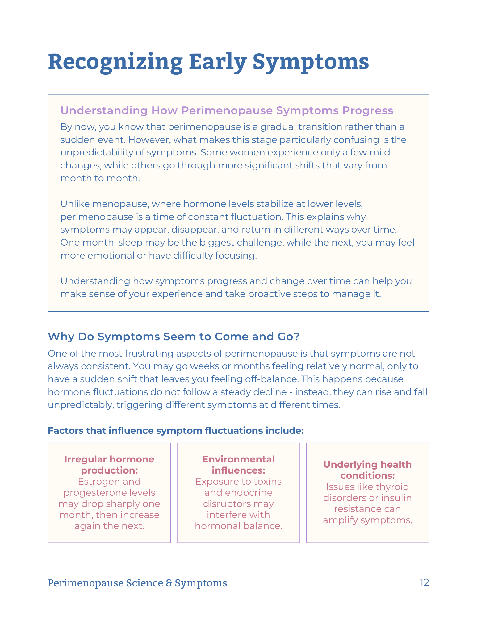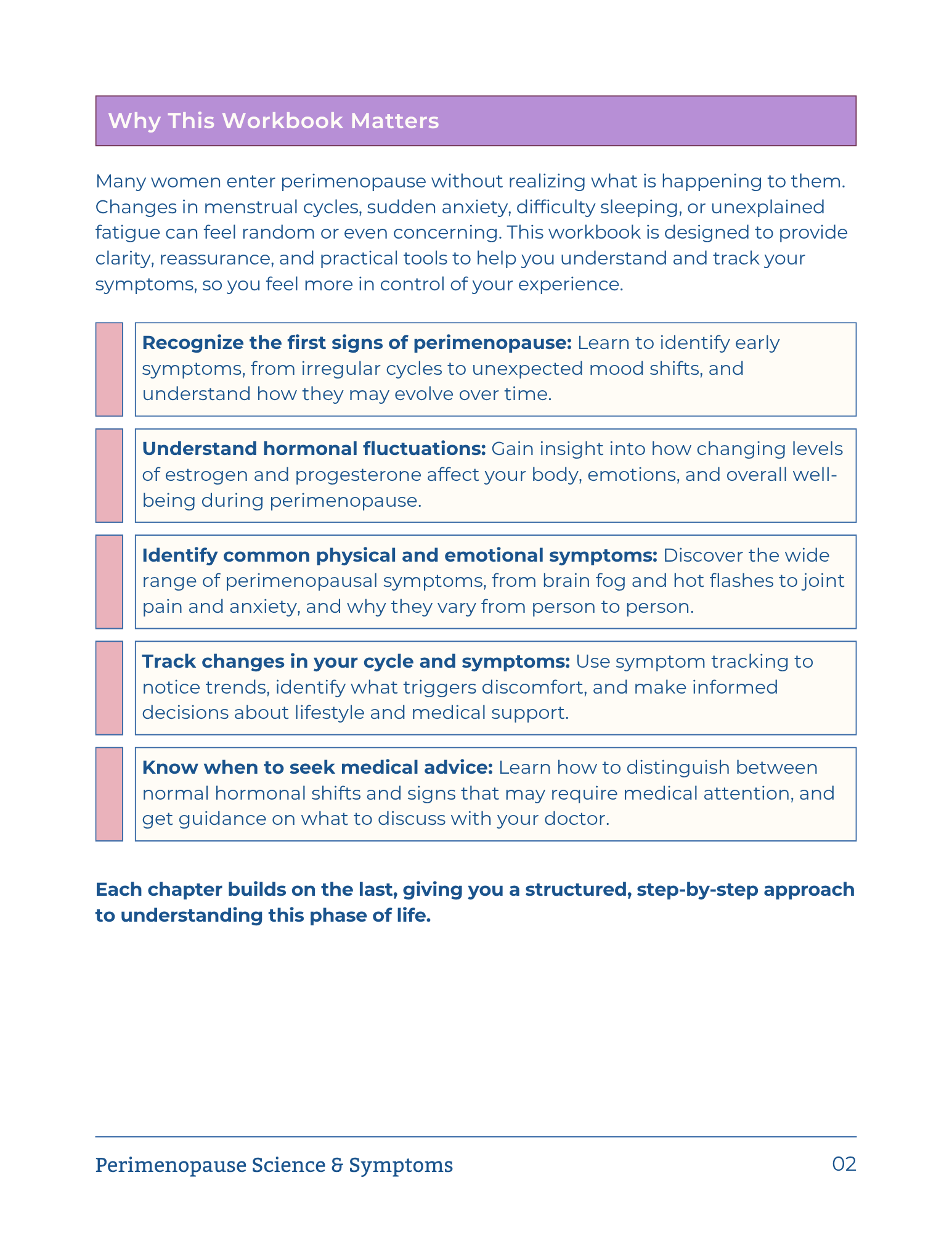 A guided workbook that helps women understand, track, and manage perimenopause with clarity and confidence. This 60-page evidence-based guide explains the hormonal science behind perimenopause and turns it into simple, actionable exercises. Each chapter combines medical insight with reflection prompts so you can connect what’s happening in your body to real-life experiences.